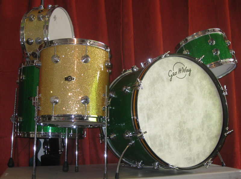 I finished a trade on Saturday of my 59' 22/12/16 BDP George Way kit plus 5x14 BDP Camco Oaklawn snare for a '61 22/14 w/ 6.5x14 George Way kit in gold sparkle and the snare drum is high on my Holy Grail list of drums. 6.5x14 George Way 16 lug drums are almost impossible to find. This is one of three that I know of. The other two are blue and red. Back in 1961 this drum was the new flagship of the George Way Company. Little did George know that by August of 1961 he would find himself out of a job and a company thanks to John Rochon. The other snare drum that is next to impossible to find is at the other side of the spectrum, the highly elusive 4.5x14 Casino model. I only know of two, a black one and one owned by a forum member here in BDP.