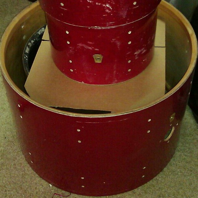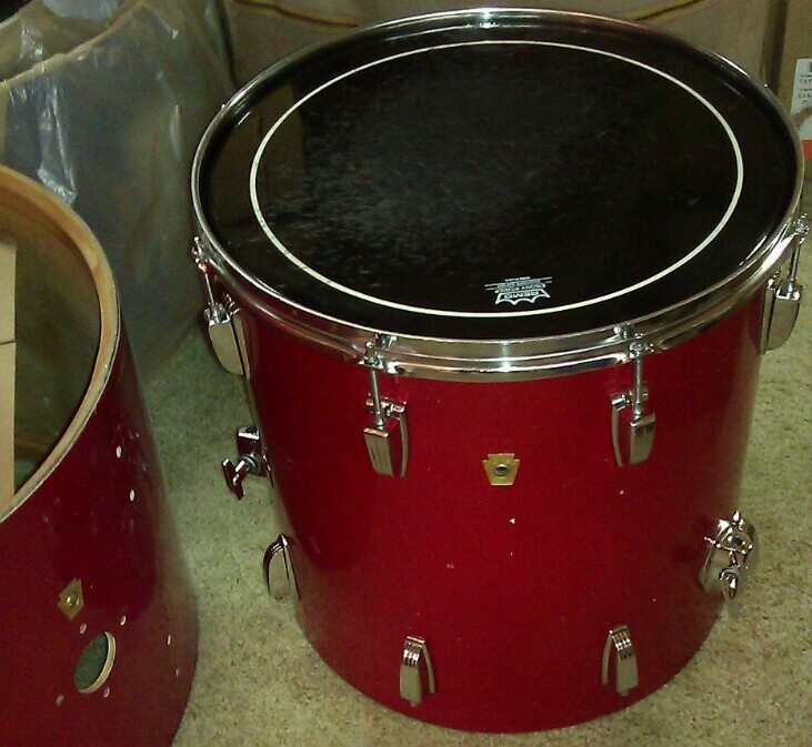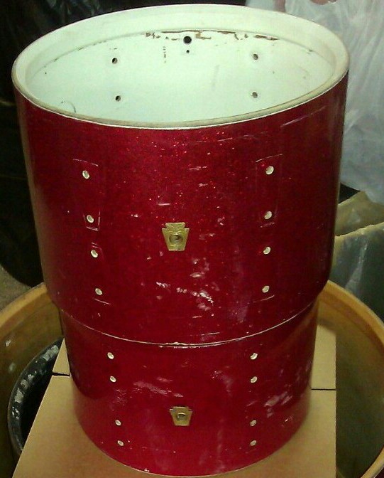 Ok so on with the kit....it is a 66/68 red sparkle 4pc Ludwig Hollywood in my favorite sizes...12,13,16, 22. The 13 and16 are 66's with resocote interiors and re-rings. The bass and 12 are 68's with clear interiors and re-rings. All four drums show quite a bit of ware but that is ok with me, i got plans for them.