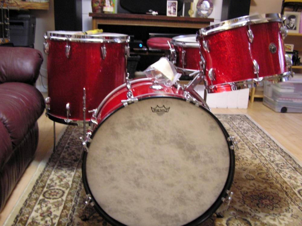Gretsch 1954 Red Sparkle drums: 20"bd/13 and 16 toms and 5.5x14 matching finish snare. This kit would be the Name Band model. The original red plastic covered throne (more of a decorative item at today's drum throne standards), There's a old 15" K Zildjian in the mix and a Hihat stand.
