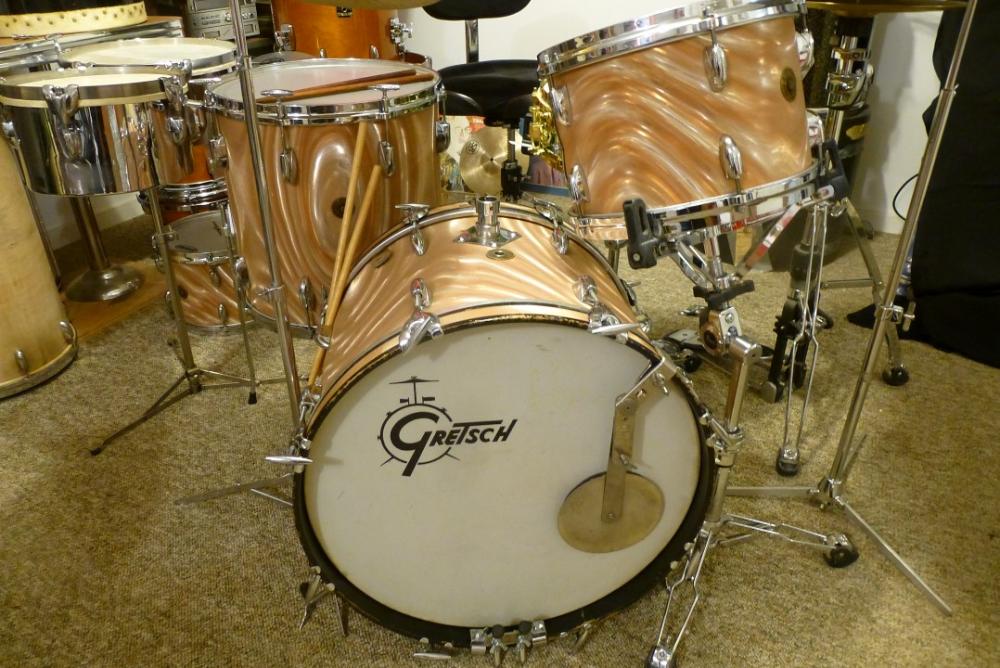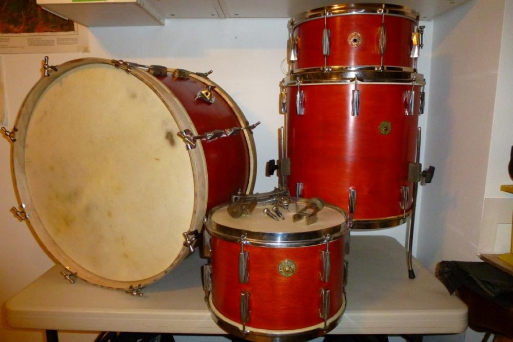 Gretsch 1940's Orphaned shellpack: 24" 1949 bd/1947 13" tom/1947 16" floor tom and a very nice 6.5x14 Super Structure snare - 1948. I bought the drums separately off eBay over a period of about a year. The finish on all the shells were toast when I received them. I refinished in a stain - copied from Gretsch Burnt Orange.
