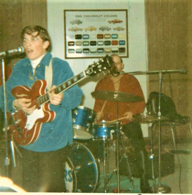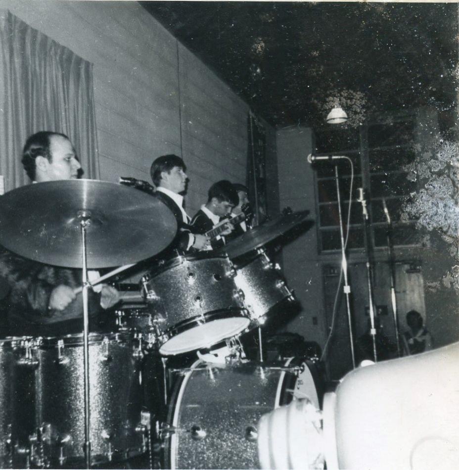 In 1964 I bought this Oaklawn Camco set when I lived about ten miles from the factory. I gigged with them for about three years. Back then I would get a new drum set about every two years just for the hell of it. I never owned more than one drum set at a time. These drums measured 14x22 bass drum, two 9x13 tom, 14x14 floor tom, 16x16 floor tom, matching Arostocrat snare drum. These drums were the largest set I ever played. I preferred either one up or two up with one down and 14x20 bass drums. Here are a few pictures of that set. White outfit photo was opening for The Animals and Turtles in 1966. On the rickety riser was opening for The Association also in 1966. The color photo and the others were playing for a young adult dances in 1965 of 1966.
