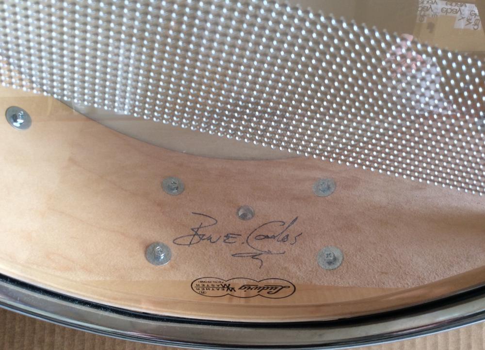 Here's an oddball prototype snare, an "Imperial Jazzfest." I changed the original heads - intending to play it (and I kept the original heads) - but then I found a common Jazzfest that matched my kit, and so this snare went into the closet. Here is the story behind it, as related by Bun E. Carlos: