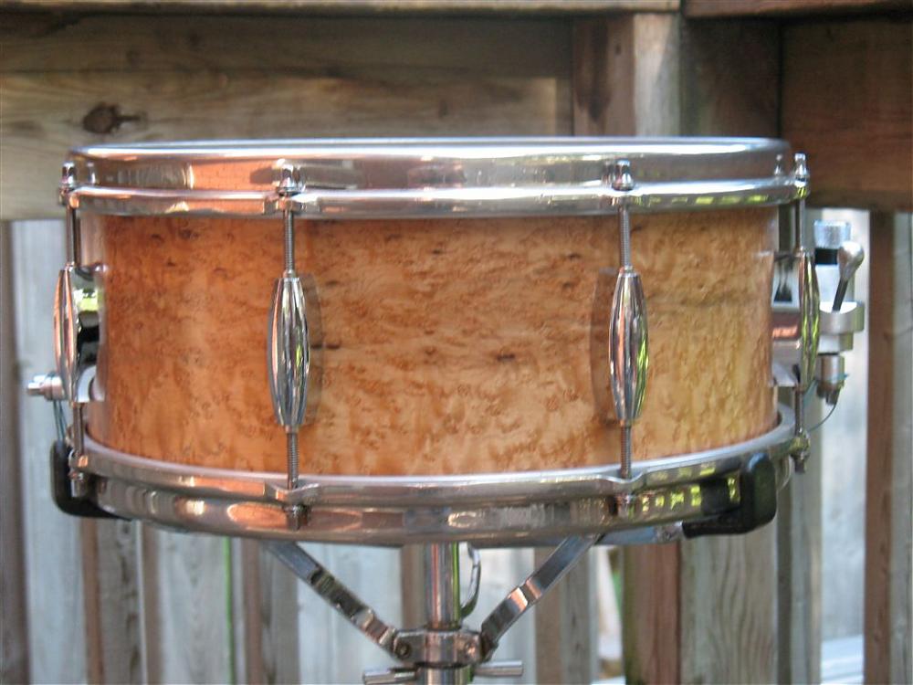 1 ply birdseye maple shell with re-rings, Slingerland lugs and rims and Trick GS007 strainer.