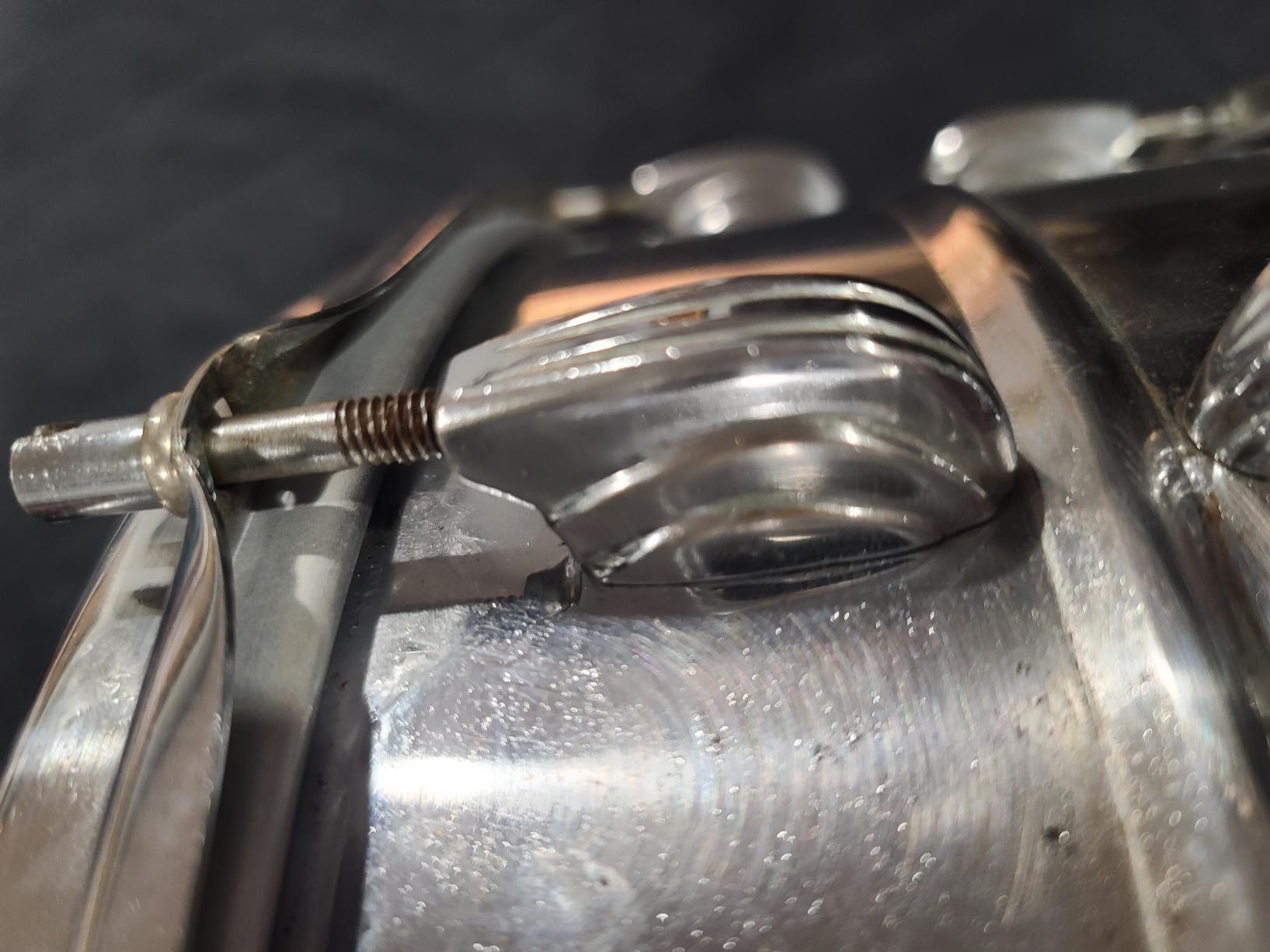 I had an email asking if this snare was made by Drouyn. The lugs (or tension casings) look like Drouyn however they don't look the same to me. Premier in the UK made snares with a similar designed casing at one stage. Also the slotted tension rods were used by Drouyn however these look different. The snare gate looks similar to older Premier snares. Any ideas? Thanks very much.