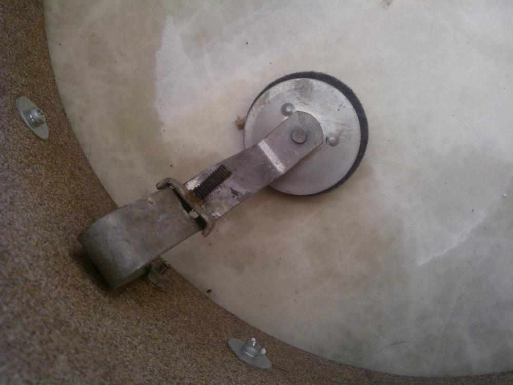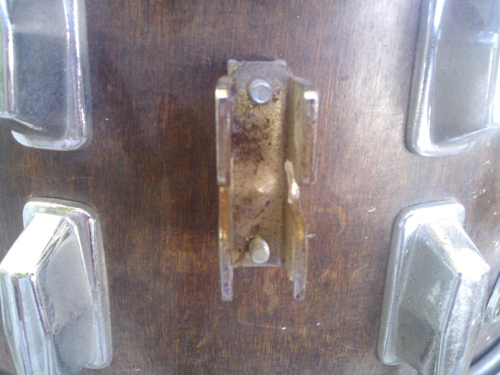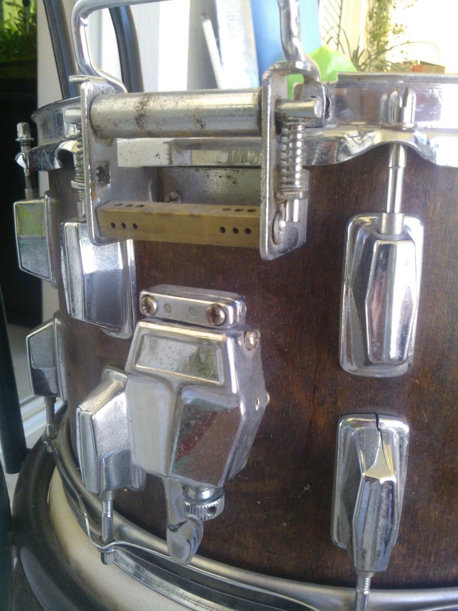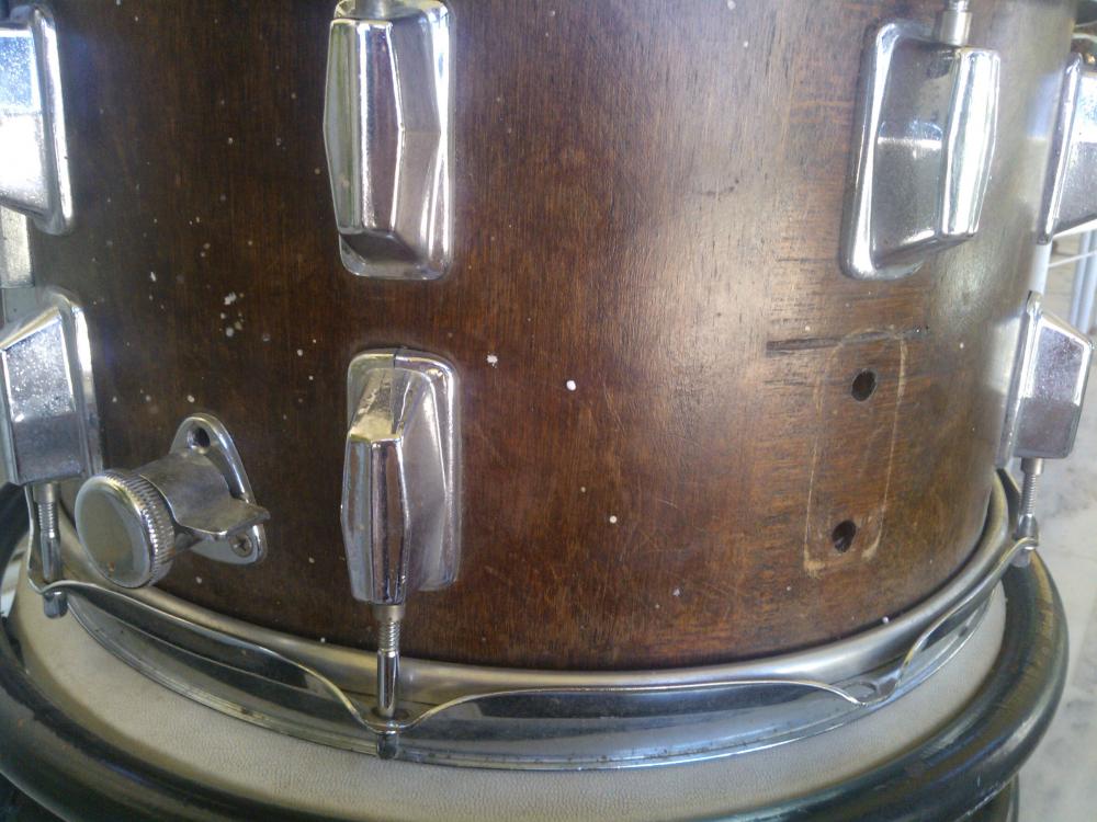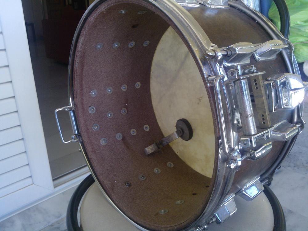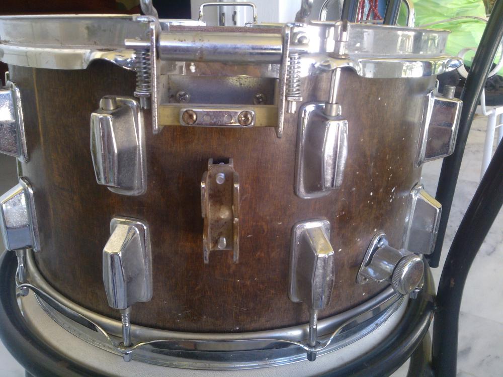 I think it must have been wrapped once, only someone removed it. Most of the top lugs are cracked, as is the top hoop (but it's not original anyway, so not a problem). Part of the butt-end is missing (I think?), no badge or stamp, no reso head or wires. The thing reminds me of an early 1980s Pearl I saw once, but the strainer, muffler and the wire mechanisms say 'Tama'-clone. I hope you guys can say more, I'm completely clueless when it comes to MIJ. Pics follow.