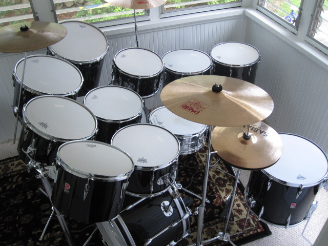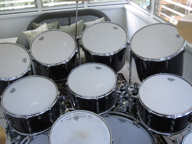Here is a shot of the additions to date: three of the four needed concerts: 14x10 (no stand yet); 15x12; and the ridiculous 16x16! Still on the hunt for a 13x9 and a second 318 LokFast double tom stand. Then rewrap. (Second kick is out with a buddy who is helping with the mounting plates).