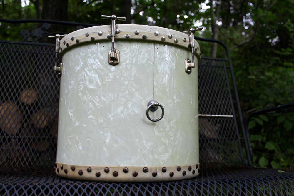 This drum is a bit of a mystery - the lugs and tension rods are Leedy/Ludwig, but the tom mounts are Slingerland! It's possible that this could have been a Slingerland "china type" tom converted to a "tunable" tom with Leedy hardware. Or perhaps it's a Leedy drum with some unoriginal Slingerland hardware? Either way, all parts are "era correct," and the drum looks and sounds great! It's most likely a Slingerland, judging by the wrap and shell.