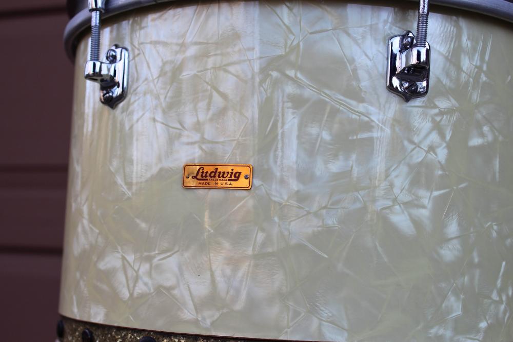 The white marine pearl (or possibly avalon pearl) wrap has yellowed evenly, and is extremely clean and vibrant. There is some minor plating loss on some of the chrome hardware.