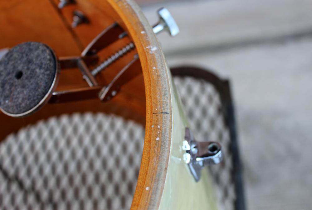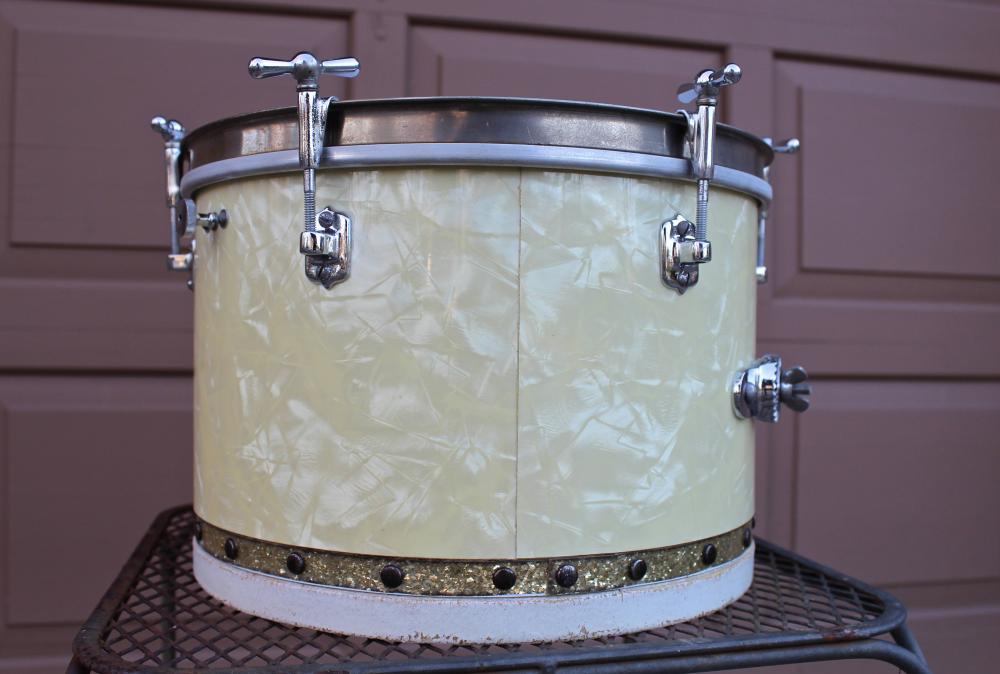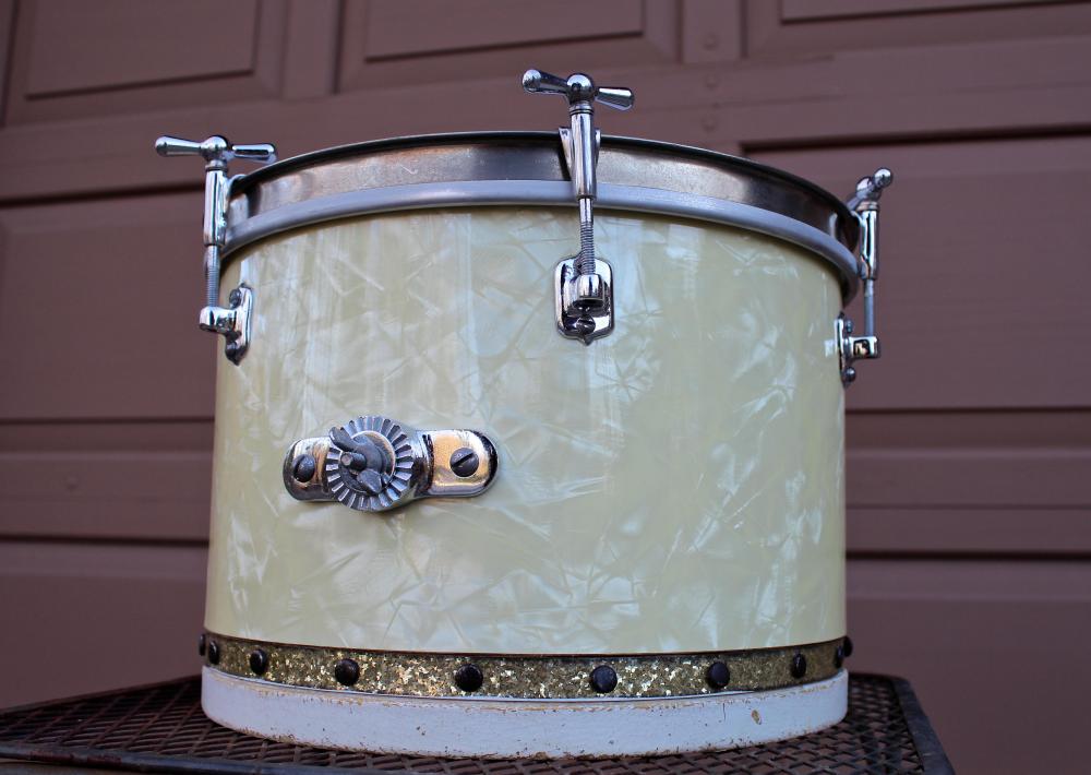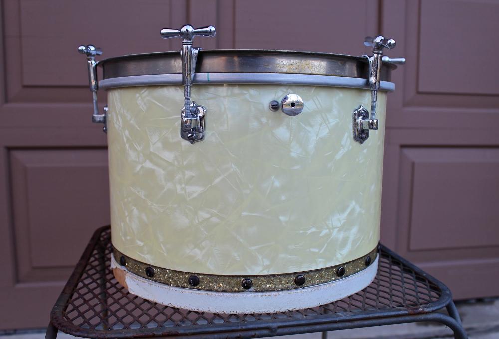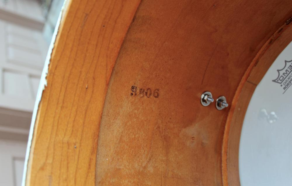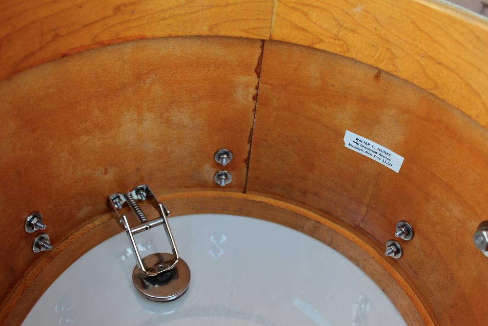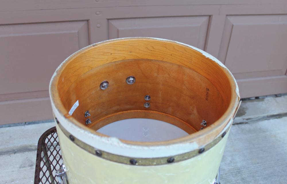 The drum is currently outfitted with an upside down Slingerland hoop to show that the hardware is functional, and the drum is in round (it actually works surprisingly well). I will include this unoriginal hoop, as well as the original wood hoop. The original hoop is only usable with a skin tacked to it.