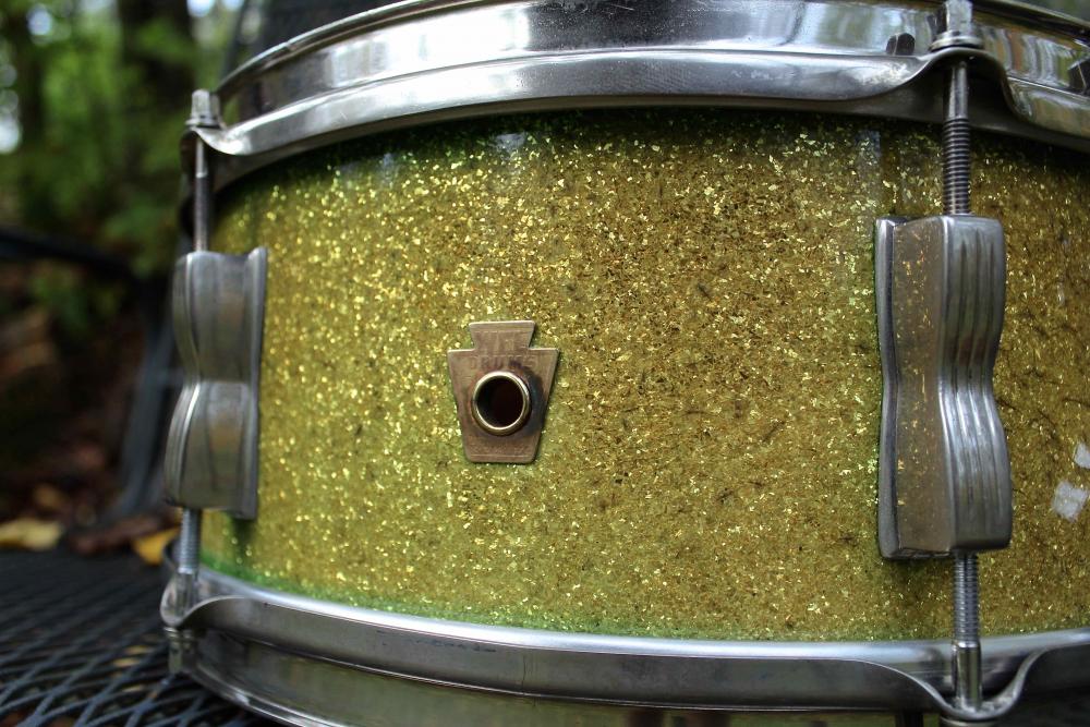 This drum is in great overall condition! It was originally green sparkle, but has almost completely faded to a gold color. The 3-ply mahogany shell is in round, and the edges are in great shape. Interior date stamped August 16, 1956.