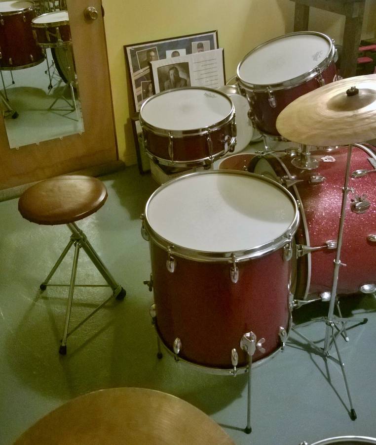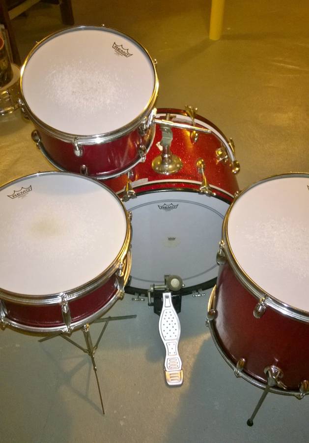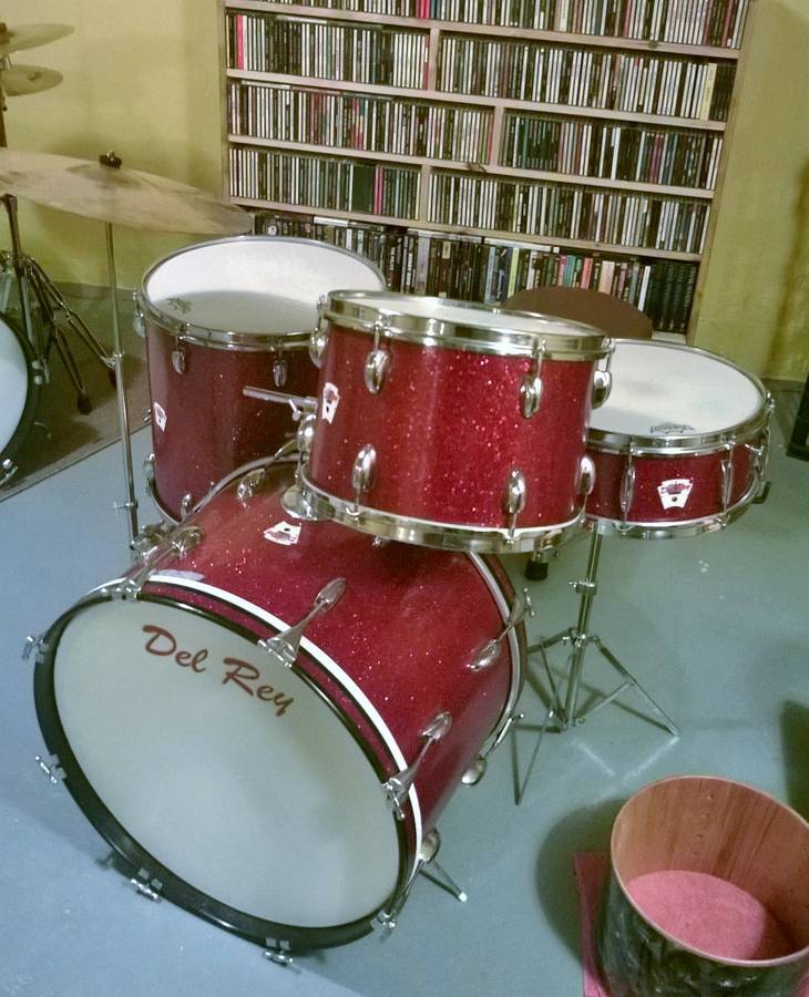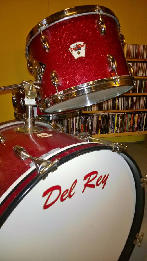 60's vintage Del Rey drum set, original red sparkle finish, stick saver hoops, original bass drum pedal fully refurbished to new condition. Sizes are 13, 16, 22 and matching 14 snare. Includes throne, 16" cymbal and stand, snare stand and pedal, brand new coated ambassador heads, with a coated power stroke 3 bass drum head. Excellent condition!