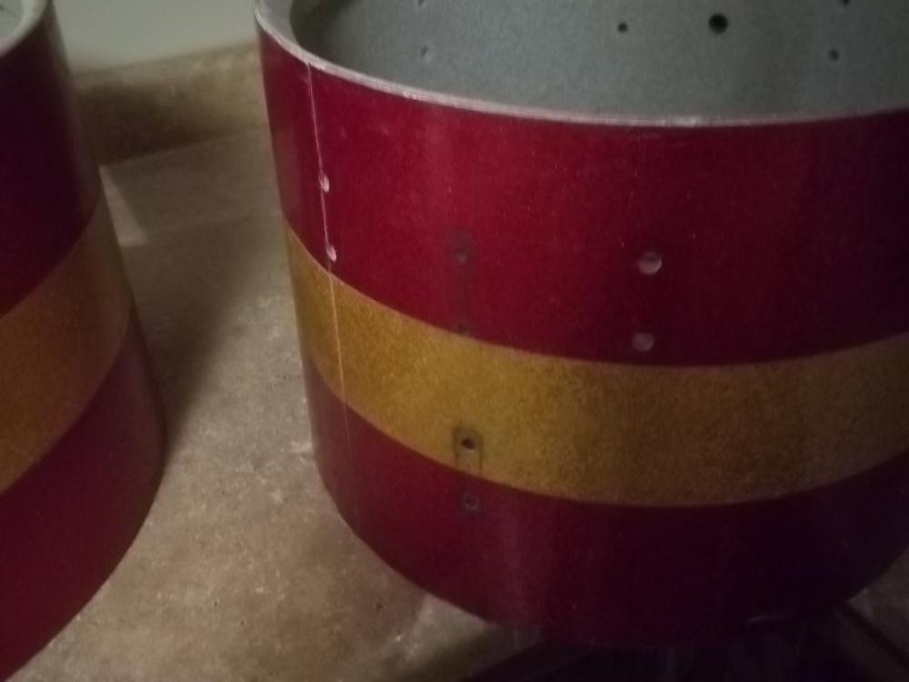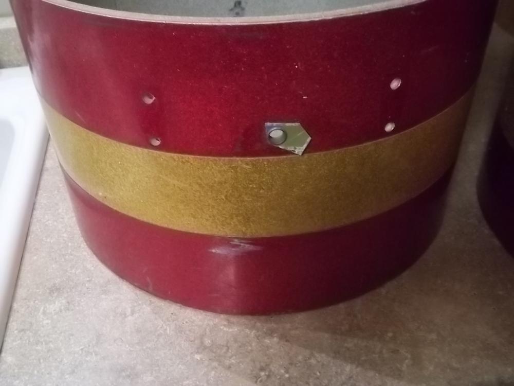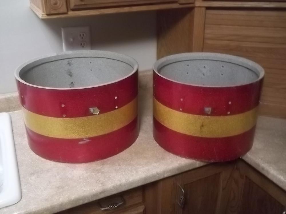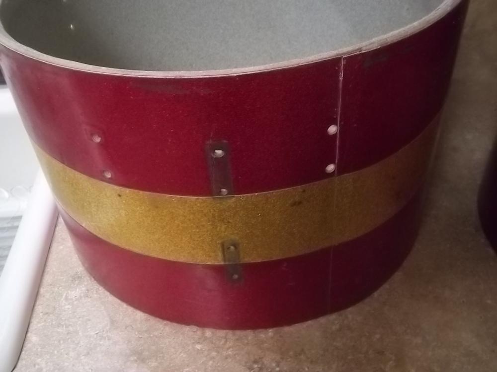 Up for sale are two (2) Vintage Ludwig Project Marching Tom Shells. The diameter (head size) of one shell is 14 inches, the diameter of the second is 16 inches. The depth of the shells are 10 inches. The shells are used, and shows signs of normal wear for their age (some imperfections, scuffs, scratches, scrapes, rust etc.). They both have factory red sparkle/gold sparkle/red sparkle wrap and speckled gray interiors. THESE SHELLS ARE NOT MINT COLLECTOR'S PIECES! The shells are being presented "as is" and do not include any hardware or heads! They are both drilled for 8 small classic lugs (batter side only) and there are extra holes in the shell where the mounts (not included) were to connect to the other drums (not included) in the marching set. Unfortunately, the blue/olive Ludwig badges have previously been removed. The construction of the shells is 3-ply with reinforcement rings. These drum shells are from the early 1970s. I have not attempted to repair, clean, or polish any part of these shells.