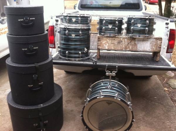 Vintage five piece set with matching snare drum. All original Ludwig drums in blue Strata. The Standard Model drum shells are the same as the upper end 1960's Ludwig drums. The 3-ply shells with the reinforcement rings. Some of the best drum shells ever made and a must if you'd like to produce that warm vintage drum sound. The cases are included and I will throw in a snare case.