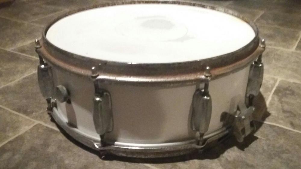 Thanks for the info. The pics you see are the ones from the ad. Once i get the drum ill get the number to you. Just cropped original pic its the best i can do for now. The wrap underneath looks like its rusting would it be a copper wrap. The hoops with the rust must be COS. Some rods need changing as they are odd ones. The snare in the late 70's catalogue is a maple finish. Wondering if this is the way to go with this as the original wrap looks like its gone beyond repair.