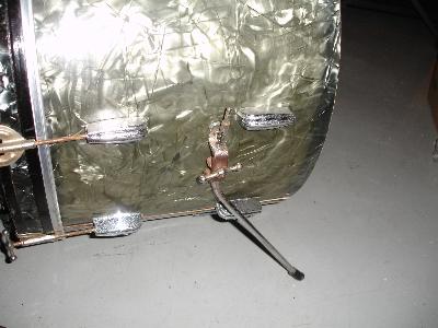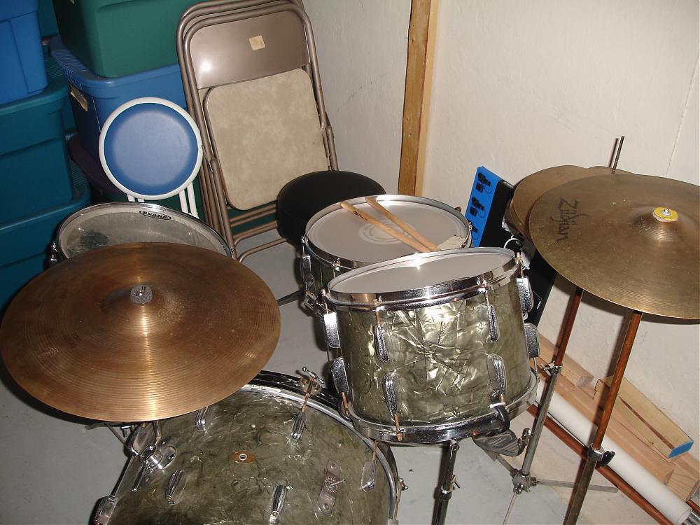 I have this vintage Slingerland kit that was given to me by a friend who's an HVAC guy (also guitarist friend) and said the person he was doing service for was throwing the kit out. He then had them stored in his garage for years and ended up giving them to me. The kit looks pretty well cannibalized. It has the copper badges from the late 50's. The snare's throw off was poorly replaced and has a Rogers bass mounted cymbal holder. The tom has a missing piece of hardware to connect to the bass so I'm using a Ludwig snare stand. It's a black diamond pearl wrap thats very faded out and looks green now. Bass is 22", 13" tom and 14" snare. Using an Acrolite '70's snare, bottom out for a tom. There's also copper pipe I'm using on the hat and cymbal stand! Here's pics.