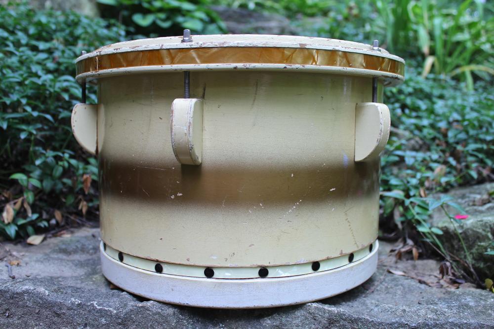 The cream and gold duco is in good shape, with some flaking and scratches which is typical for drums this age. The white marine pearl inlay is vibrant, and hardly faded! The top hoop has a very rare butterscotch pearl inlay - definitely not something you see every day.