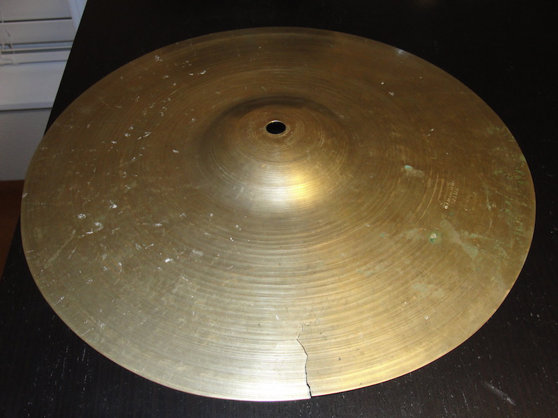 I also have a 12" thin splash cymbal that I believe is from the same era. It has a large crack along the perimeter. I am including that cymbal free with the purchase of the 10" cymbal. The 12" is depicted in the last photo.