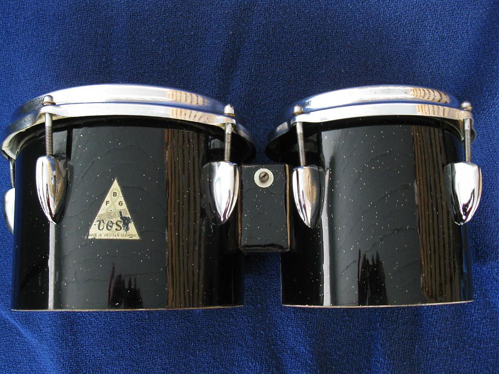 (Voss/Tromsa Bongos made in West Germany). Last May I found these in a degraded state, & shelved them on my refurbishing waiting list. This week I finally completed the restoration. Apart from the fun & satisfaction of doing a project, they are nothing really special. Like many drum companies, their bongos don't seemed to be aimed at serious players, but designed for schools & beginners. One item of interest was the construction of their lugs. They are visually appealing & have an excellent chrome plating, which cleaned up easily. The steel hoops were cheaply plated & showed lots of rust & peeling. The black/gold particle wrap held it's integrity & cleaned up very well.