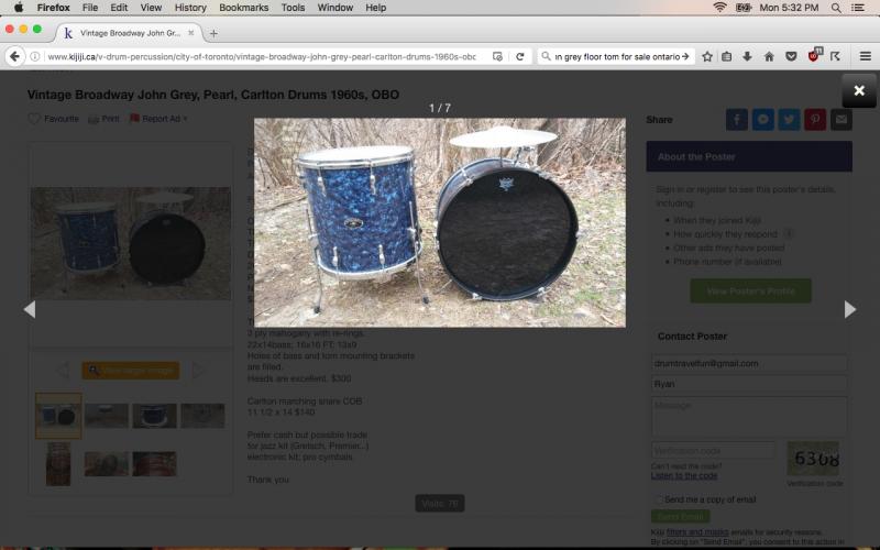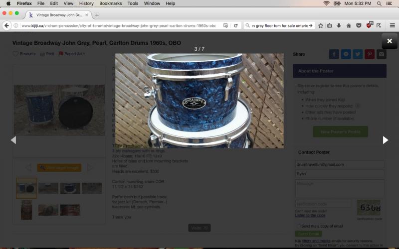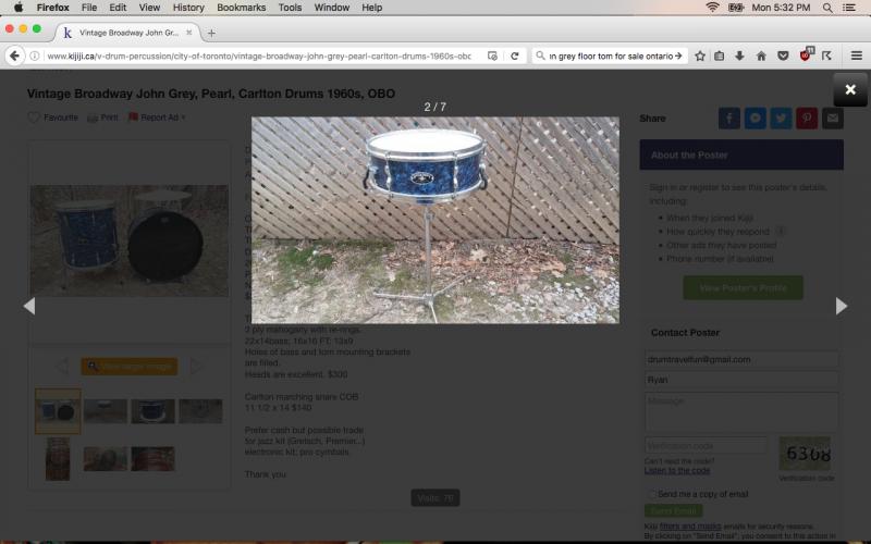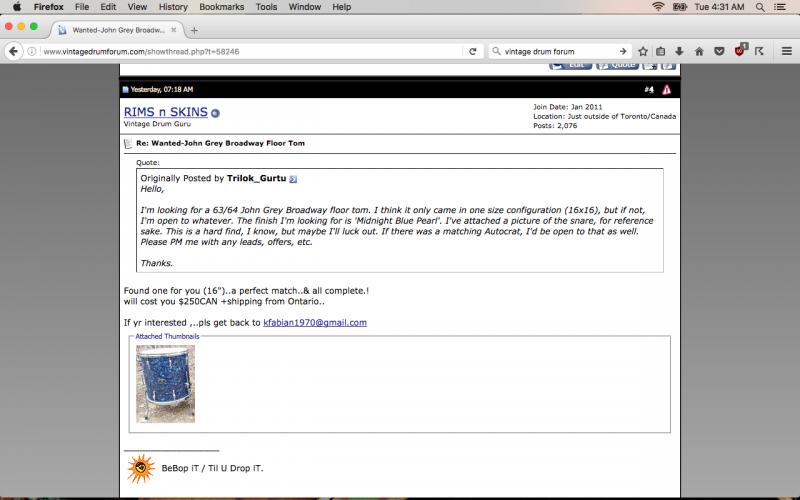 I'm looking for a 63/64 John Grey Broadway floor tom. I think it only came in one size configuration (16x16), but if not, I'm open to whatever. The finish I'm looking for is 'Midnight Blue Pearl'. I've attached a picture of the snare, for reference sake. This is a hard find, I know, but maybe I'll luck out. If there was a matching Autocrat, I'd be open to that as well. Please PM me with any leads, offers, etc.