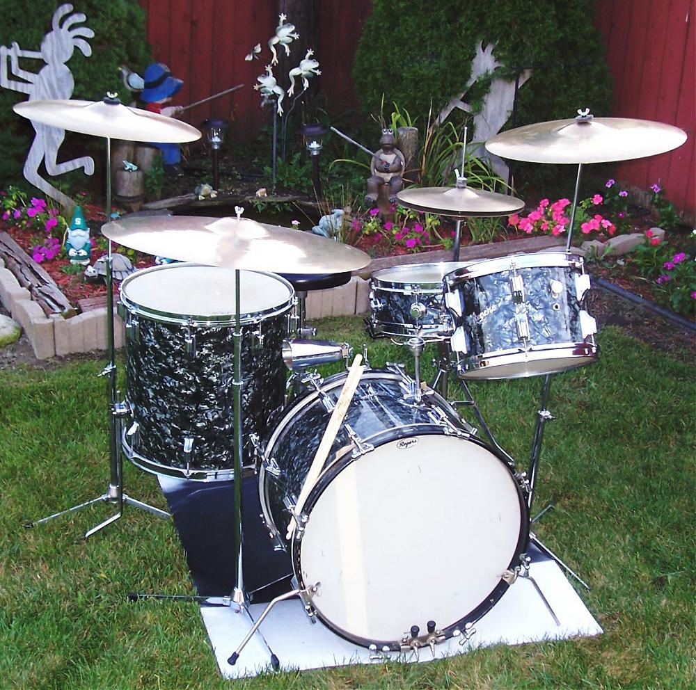 The first is either a WFL or Ludwig (I'm not sure since the strainer says WFL, but the badge is a Ludwig transition badge) White Marine Pearl Super Classic.