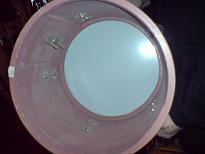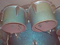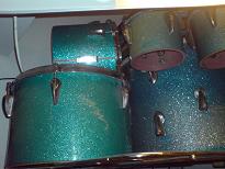 Saw this extremely odd kit in a shop in a very isolated part of Sweden. It has six concert toms ranging from around 8" through to around 15" (didn't have the opportunity to measure them) mounted around the edge of the bass drum. The bass drum is on it's side and the bass drum pedal/beater plays from underneath, in classic cocktail drum style. A nice looking aquamarine sparkle wrap on it.