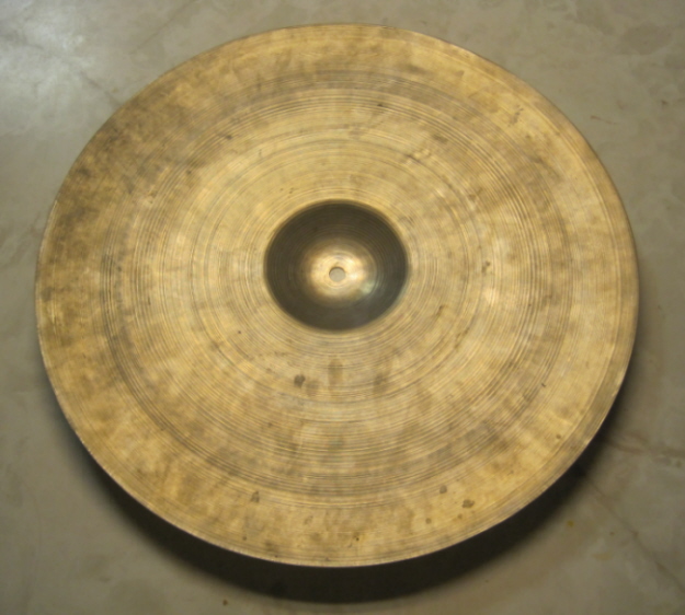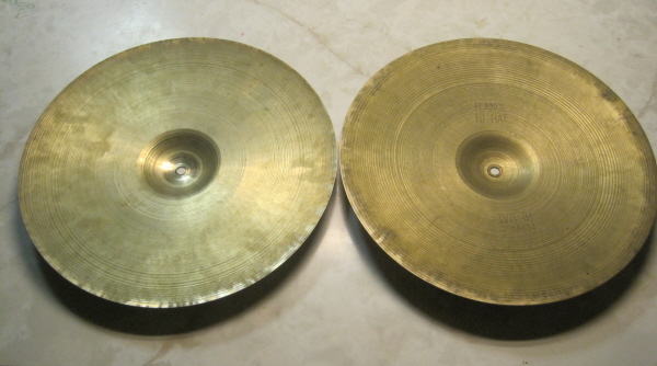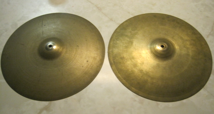 [COLOR="Green"]I have two pairs of Flange 'Hats...one trans-stamp set and one 50's set (same stamp as yours). Both of mine are 14's. They are cool...very sizzly & sloshy, very thin. Interesting Jazz hat's. Obviously they aren't very crisp and projecting.
