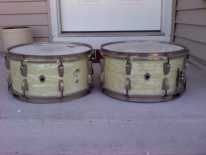 I picked up these two snares today. The didn't come without "issues." One is not so bad and the other carries most of the issues. I will post each seperately to not get them confused. They look like 40's WFL? The badges are chrome color with the address on them. Below is a pic of the badge that is on both and them together. I will go with the #1 more complete one first and then #2 which has more details.