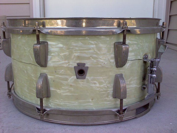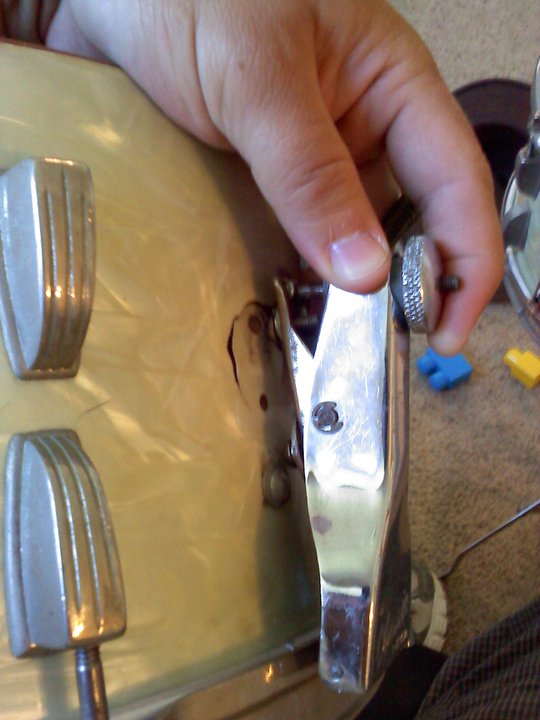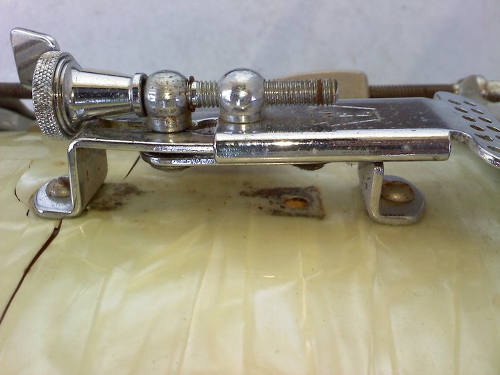 Here is the first one. The lugs and rims look to be nickel. The throw off and baseball bat muff look to be chrome. Not original right. The throw off also has an extra hole underneath it. (see pic) Otherwise this one looks pretty decent. I need to put new heads on it and get a snare wire for it. I would kinda like to get the original throw off for it. Can anyone tell me the difference of this one to an original?
