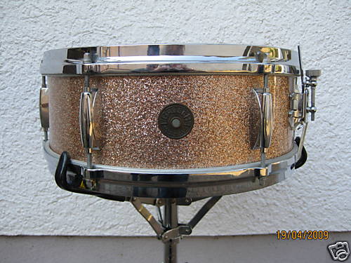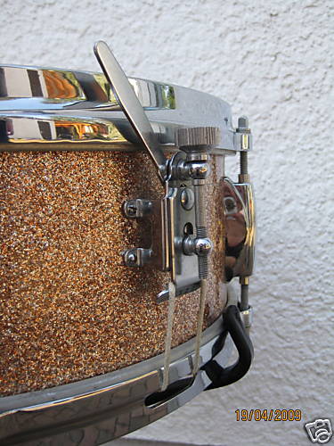 the drum is light as a feather. with a real calf head or, in summer, a renaissance ambassador on top, it reminds me of the radio king sound on old records. woody, cracking rim shots. It´s white marine pearl large pattern. the only problem is that the hoops are somewhat weak, they bend at the clips, so I have to tune it up and also turn the hoop at times.