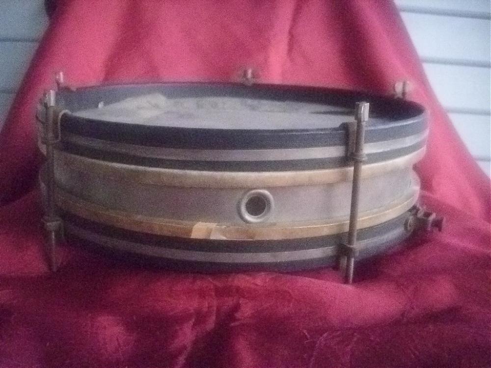its a 3x12,i believe a aluminum shell,wood hoops with tin? inlays,heads feel like paper but the top head (with cartoon artwork from the period) is thicker than the other side,no holes for a butt or throw off.