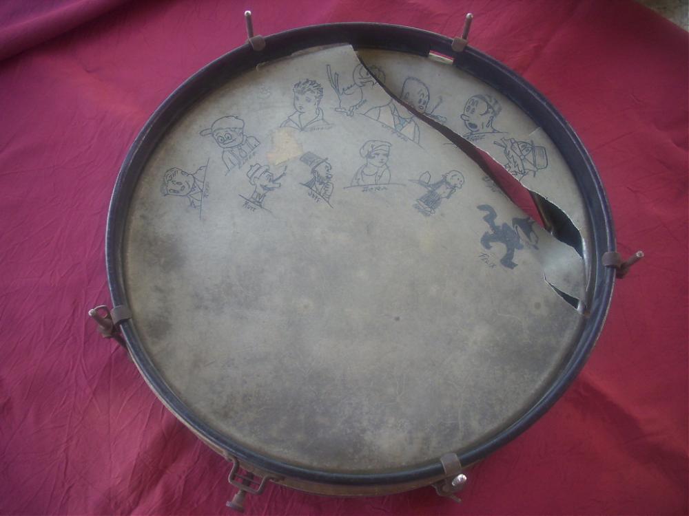 alright,if i did this right,you should see some pics.this computer is weird on loading pics on forums.sorry for the pics as the camera died on me while taking these.anyway,my boss gave me this when i bought some parts(plus another snare which i'll post later) i know its a ludwig,but other than that-i have no idea.my so called vintage knowledge stops around the usual drums you see from time to time.i can't even find any info on it.its a 3x12,i believe a aluminum shell,wood hoops with tin? inlays,heads feel like paper but the top head (with cartoon artwork from the period) is thicker than the other side,no holes for a butt or throw off.student drum or kids drum? i don't need it so i'm gonna sell or trade it.but thought i would ask.