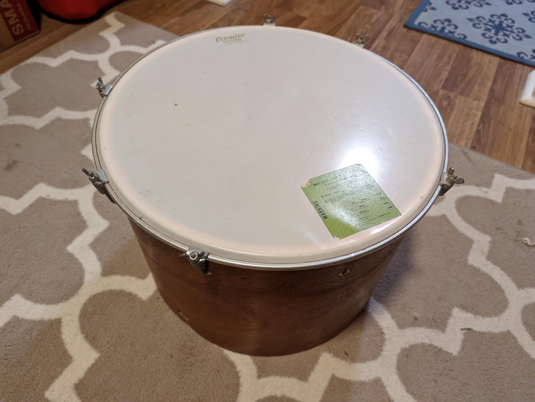 It is a Premier New Era timp-tom. Kind of a low end drum but still a Premier. They show up on Ebay every once and a while. I haven't seen them in any catalogs that are available online. They were probably aimed at the educational market. It's a three ply Mahogany shell with a single Beech re-ring. The square holes in the shell were for legs. I will try to find some pictures.