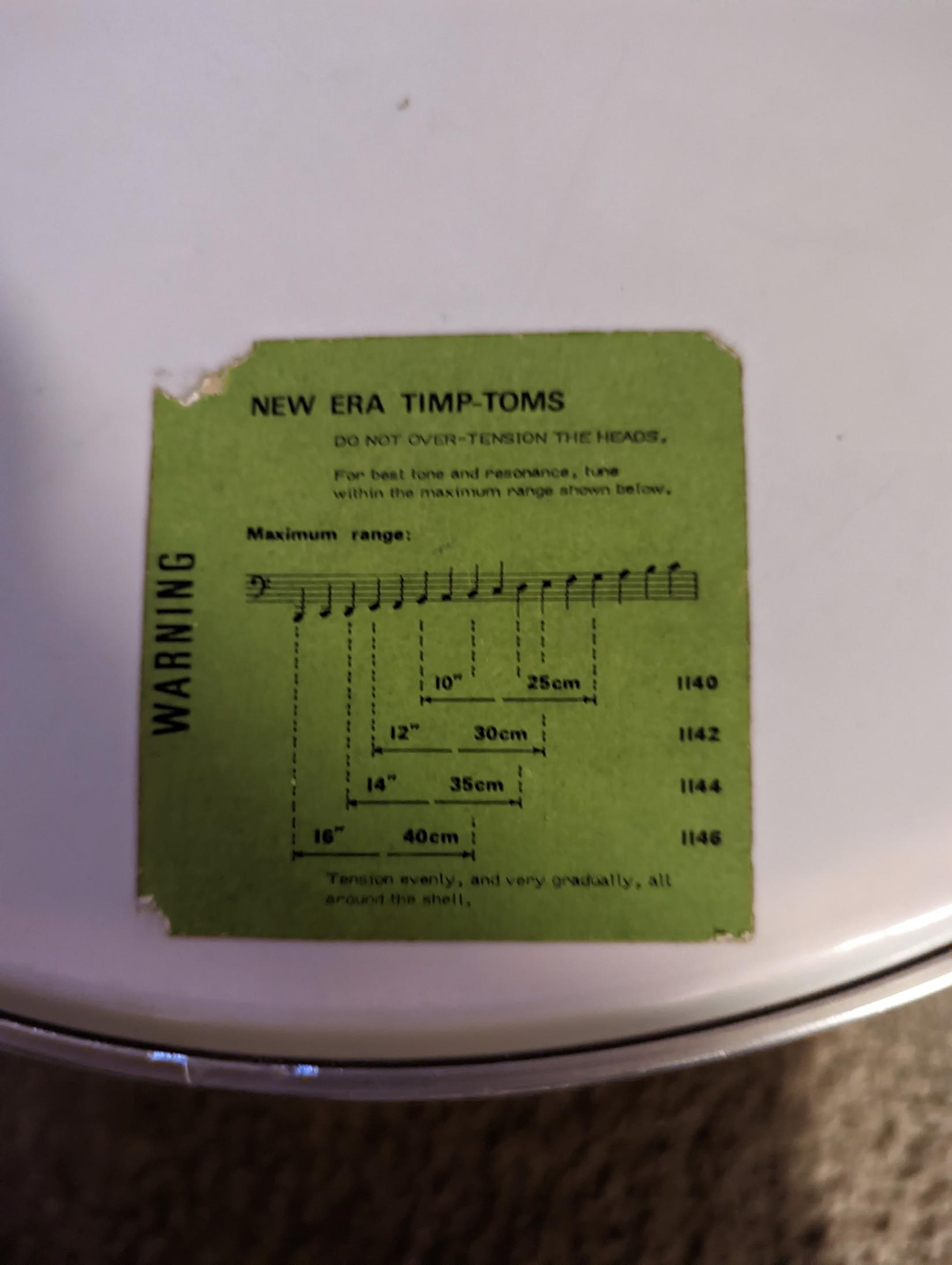 The green sticker shows Timp-Tom tuning range. I've not seen these tension rod styles before. Head is a Premier.