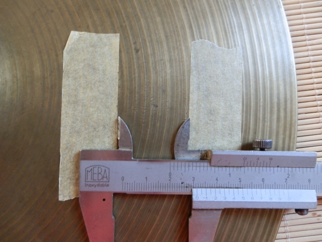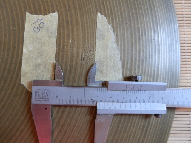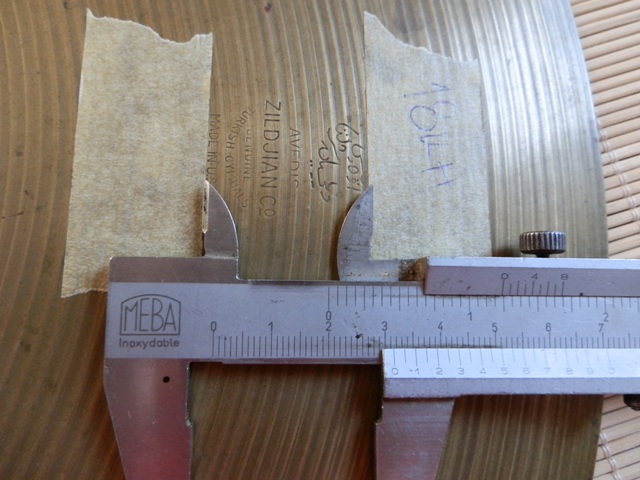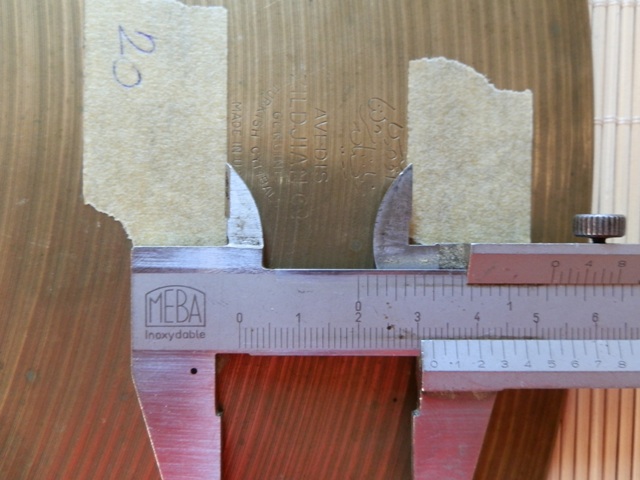 The 20": this has the three dots and I'd say it is closer to 1 3/16" (which we would like it to be) than 1 1/4". I say that because it looks like the jaws of your calipers are just at bit wide. I can see plain cymbal below the MADE IN U.S.A. and since it only takes 1/16" to make the difference I'd say it is a 60s stamp.
