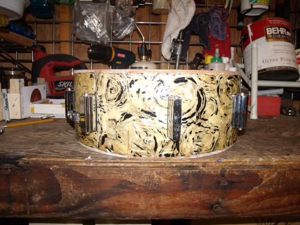 So in the lot of MIJ shells was this guy. Now I refinished this with scraps of Fantasia Pearl wrap from the Kent shell. I cut it down to even strips and did it right, also added the Pearl lugs. I think it looks classy. Now my question. The interior looks to have the " zola " coating typically known with Tama Imperialstars & Swingstars. I know they did make some wooden snares. Could this have been one of those shells?