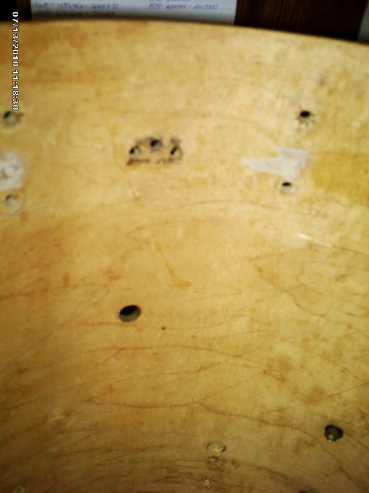 No. It was hit from the outside of shell kind of like a flying saucer. Maybe they were playing frisbee with a hi-hat cymbal? flowers2 But it sliced through the wrap and poked the shell interior, just kind of fractured it,ya know? As far as the species of wood, I'm lucky if I count the plies and get that right, how the heck ...oh, by the way Was I right about the 2 plies? Burger Kin