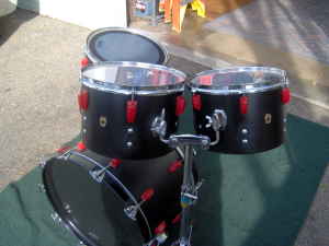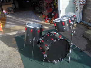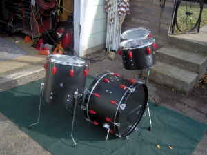 That reminds me of the hacked up 3pc 1980s? Pearl set I saved from the trash and made my Cocktail drum (as seen in another thread at this site) out of. The previous owner had removed the reso heads and associated hardware on the Bass, Floor Tom and Up Tom and had painted the shells flat black. It might have been some kind of fad for a certain group of musicians in the 80s – 90s. I condensed everything around the FT to get the Cocktail drum and left it flat black. It is ugly but works the way I need it too. Doesn’t sound bad either!