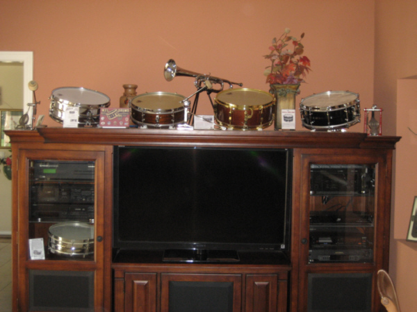 As far as displaying "my passion" (well one anyway), I guess I'm just lucky. My wife loves my drums and encourages me to display all that I want. I have my snares, a Ludwig single valve bugle and three vintage foot pedals on/in the AV cabinet in the living room. Also in the living room are my congas and a Roland HD-1 practice kit. My Hollywood kit is scattered around the house, in cases with table cloths over them like end tables.