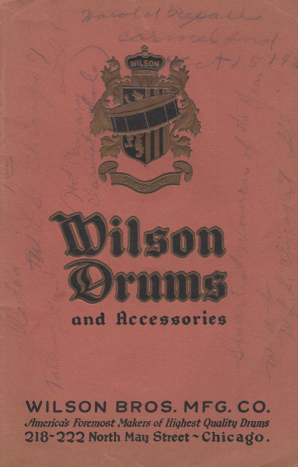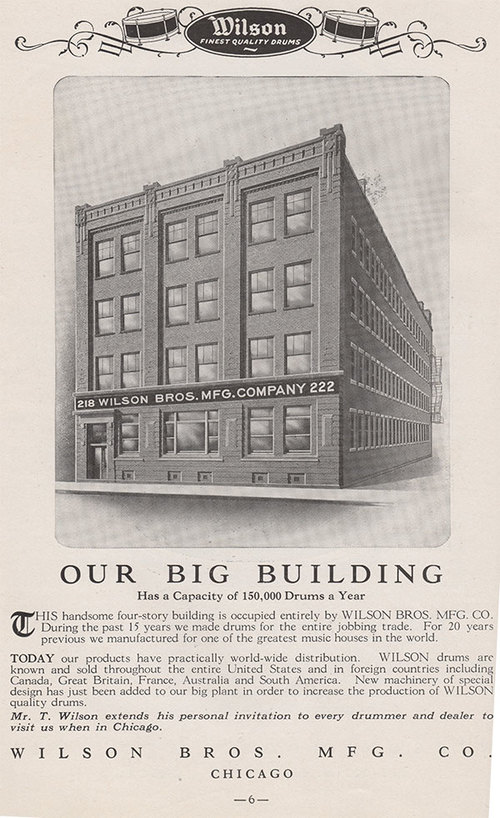 Chicago played such a role in the 20th century history of American drum companies. Ludwig, Slingerland, Camco, Liberty, Lyon & Healy, Novak Drum Supply, and today’s featured company—Wilson Brothers. Tom Wilson stated that he became involved with drum building in 1887, and by 1907, he was a principal in Wilson-Jacobs, the predecessor manufacturer to Wilson Brothers, founded in 1917. Wilson-Jacobs sold drums to music stores and distributors for their private labels. Wilson Brothers sold directly to the public, at first, and, then, through music stores. I have no information on Tom’s other brother or brothers.