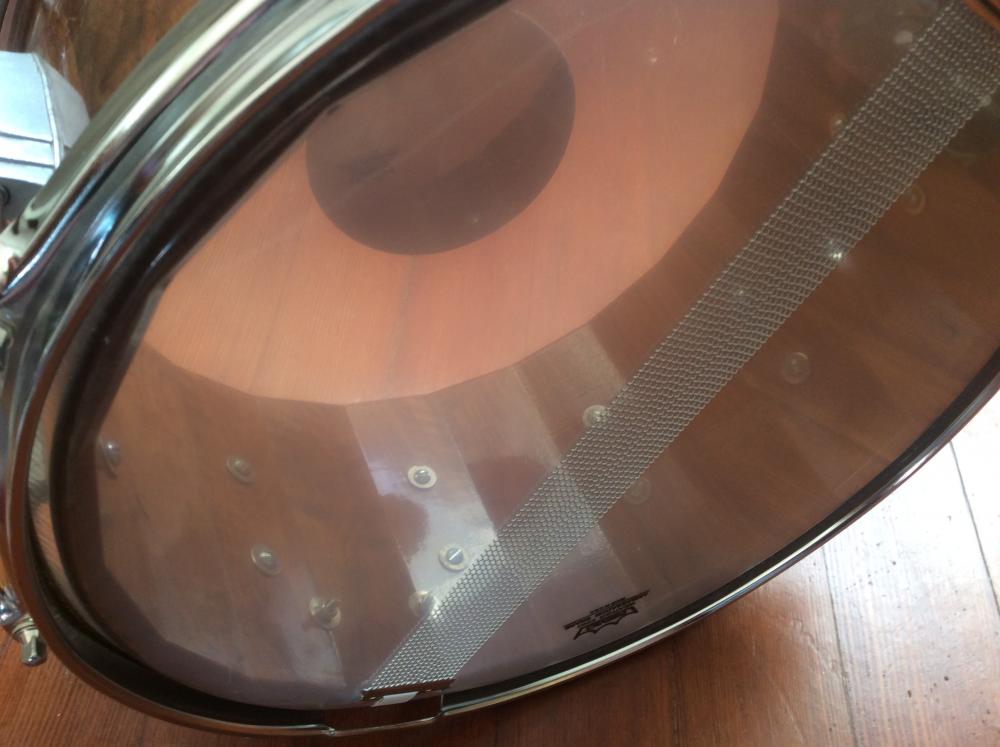 I owned quite a few of these snare drums and a couple stave kits from this drum maker. These drums were made in the mid 90s out of many different hardwoods: maple, black walnut, hickory, ash, and oak. My understanding is that the gentleman who made these great drums passed away around 2000-ish. These drums were quite a rarity in that no one was making stave full kits in the mid 90s. He had his own floating lug design later on, so you either have an early drum or a later owner drilled out the shell for the current lugs that you have on the drum. The drums were finished inside and out with a gloss lacquer, but they were only lathed on the outsides, leaving the insides angular with the different stave pieces. My two kits were: Walnut, and one combination walnut/maple...both were 10,12, 14 toms with a 20 bass drum. The drums were killer sounding and I regret selling them! I bet that drum sounds pretty good! Rob