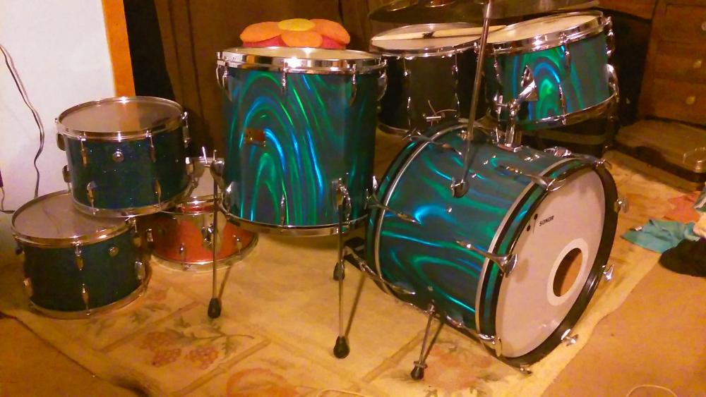 I have a turquoise satin flame set from about '67, just 20/13/16, no snare. The wrap is in great shape, for a satin flame, but there are some dings and scratches. One of the floor tom leg receivers is wrong and made an extra hole. Replacement felt pad on the muffler on the 13". The T-rod on the BD tom receiver block is missing and has been replaced with a modern square-head tension rod. Also missing the BD-mounted cymbal arm. If you are interested at $800 I will get some better pics together.