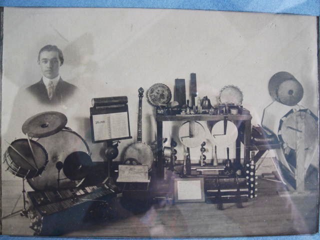 This is a photo portrait I found many years ago of a Professional percussionists. (This was not taken from a magazine). It was probably used as a handout in a resume. There are about 35 sound effects, plus a drumset, banjo & orchestra bells. In the past decades of collecting. I've found about 3 or 4 suitcases belonging to players of this time period. They are an especially prized find , & always a surprise as to what will be inside.