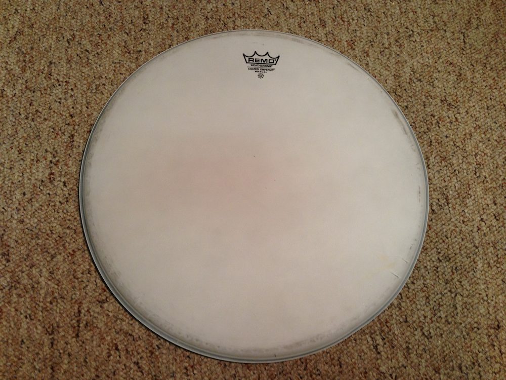 It's got some dark rub marks and a couple little crimps around the edge from when I tried to fit it on an odd sized snare, but fully functional, no holes, and the marks would probably clean off.