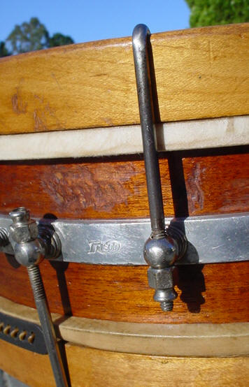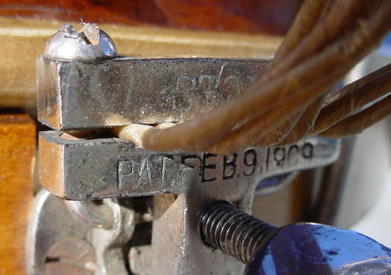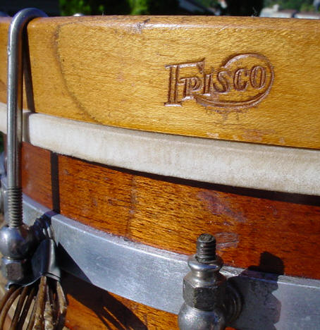 The shell looks like solid mahogany with maple hoops, I especially like the FRISCO stamp on the top hoop. There is a metal ring around the center of the shell with eyelets that receive 20 claws and 20 nuts for the top and bottom tensioning. The center ring also has a nice FRISCO stamp along with the M. J. Kochman & Co. of San Francisco stamp. The drum was missing one claw and one nut so a special thanks goes to my machinist Abe Abello (Weld-Tec Redwood City, CA) for reproducing a claw and nut. This guy is worth his weight in gold, you cannot tell the repro from the original! A special thanks also goes out to Bill Wanser for tucking/mounting a 13.5 batter head and wiring up the gut for me. The strainer is a Stone strainer (Pat. Feb. 9, 1909). A little lemon oil brought some life back to the shell.