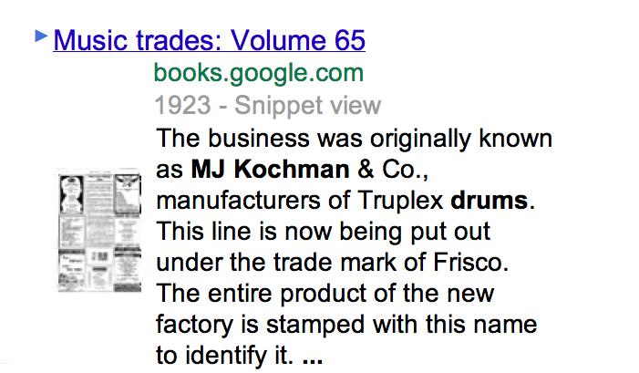 And that about tells you the extent of my knowledge about this drum. I have hundreds of old drum catalogs and all that I have found (via Google) is that the M. J. Kochman & Co. of San Francisco made goose call boxes. So I invite you to weigh in and send me some information about the M. J. Kochman & Co. of San Francisco and this Frisco snare drum.