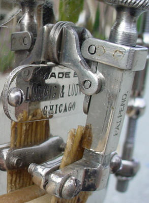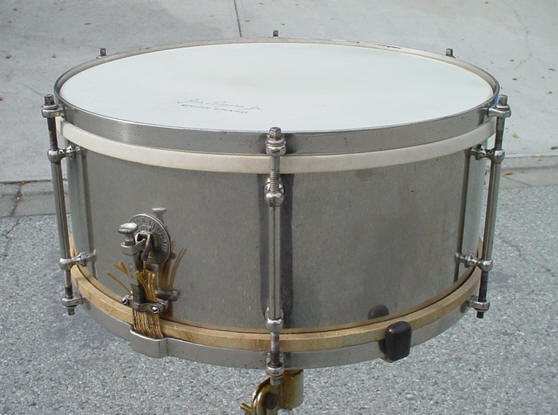 The drums were in very good shape given the fact that they are pushing 100, (we should all hope to look this good at 100 yrs. old!). I used Simple Green to clean the years of schmutz that accumulated on the shells and hardware. All of you know that I constantly preach: "rust does not sleep"...so any rust was handled by my trusty Dremel tool, soft steel brushes and 0000 steel wool (note to the Purists: don't get your undies in a bunch, no damage was done to the hardware with the 0000 steel wool). The 4x14 came to me missing the top rim so I had to have one fabricated. My machinist Abe Abello came through once again, notice how he nailed the "ears". If I hadn't pointed this out to you the top rim would have passed easily, that's how good Abe is! A thanks also goes to Les and Brian at Avenue Plating for the nickel plating.