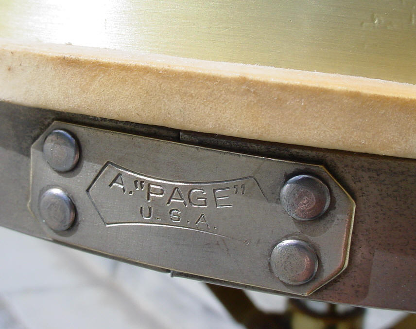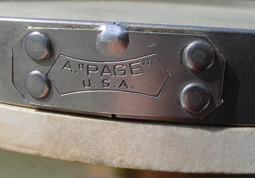 Another one from the fertile waters of Ebay. It is my goal to someday have a museum of rare American-made drums. Part of the museum would be old snare drums that have maybe fallen through the cracks of popularity but are still cool like Duplex, C. G. Conn, Bower, Nokes & Nikoli, Ditson, Stromberg, Frisco, York, W&A, Wilson and the drum presented here today: A. "Page" U.S.A. I am glad that there is an identification stamp on the top and bottom rims or I would know nothing at all about this drum. I always welcome any added information so weigh-in if you want to.