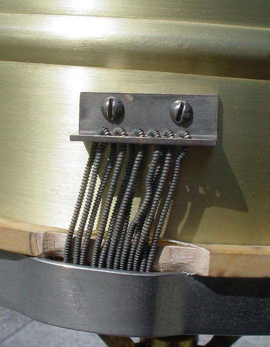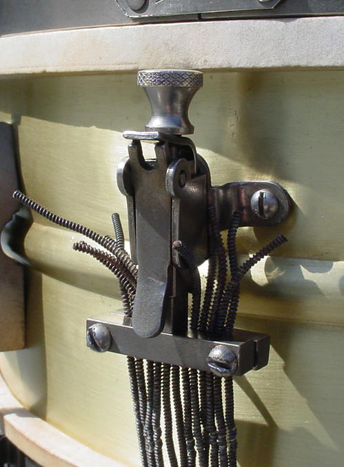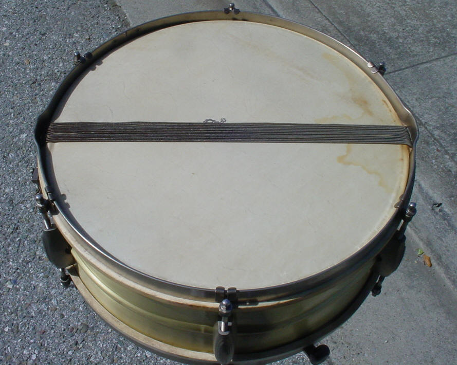 Of-the-era 14" calf heads fit the shell perfectly but the slunk head had to be "modified" as the bottom rim left absolutely no clearance for the silk-wound steel snare wires to pass from the butt plate to the strainer.