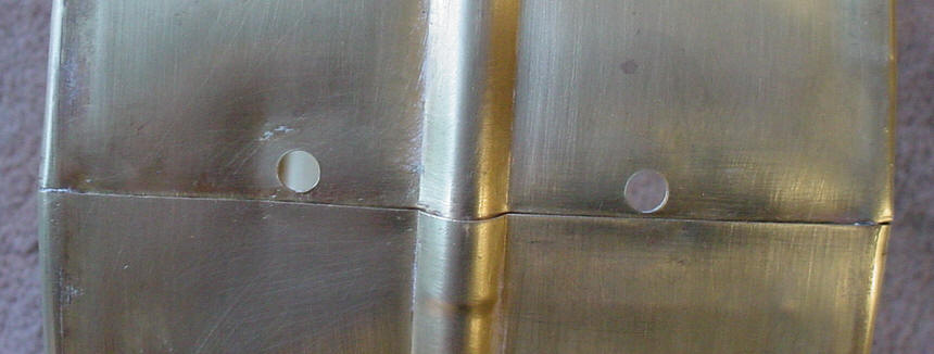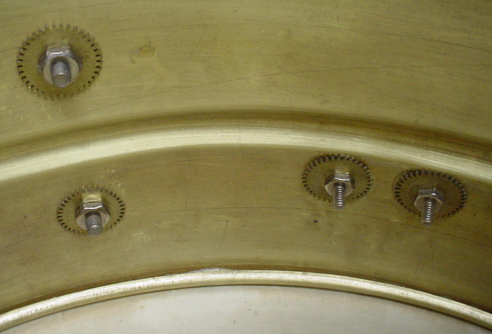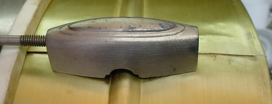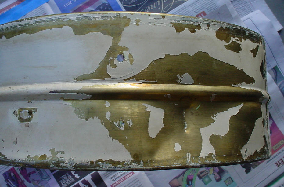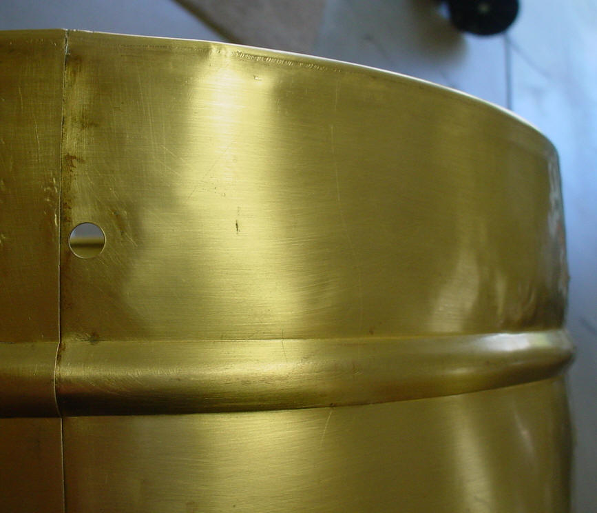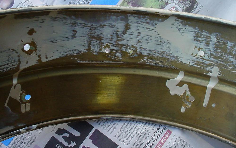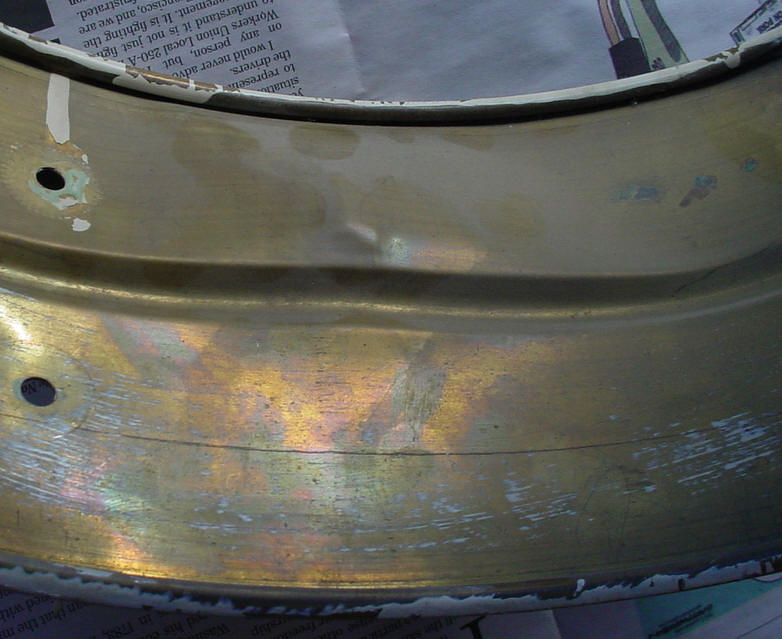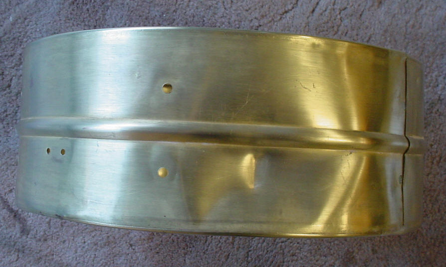 I thought that I was buying a white enamel over brass snare drum and that's what showed up. Unfortunately the white enamel is an after-market job. The exterior was somewhat believable but the interior told the tale so I stripped the white enamel down to the brass shell and Brian Hadnagy of Avenue Plating gave it a shot of clear lacquer to preserve the age of the shell. I decided to leave the brass shell as is because that was probably what it looked like before the white enamel was applied (read slopped) onto the shell. There were a number of dings and dents in the shell that I was able to take care of but there was one huge dent that needed professional help. One needed to really go out of their way to produce a dent like this one; think yesteryear fraternity party, free flowing booze and a 3rd story window as the perfect launching pad. Les Hadnagy of Avenue Plating came through once again as can be seen in the before/after photos. The shell is a one-piece brass, single bead shell that is somewhat crude and light-weight with a weak looking seam. There are no snare beds. I am not sure of the reasoning behind a 5 1/4" shell vs. a 5" shell.