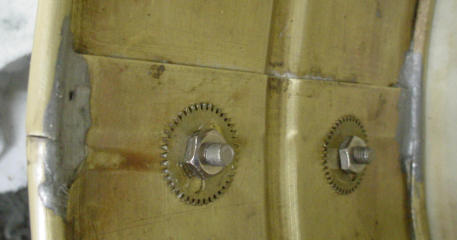 All of the hardware is nickel plated and I chose to do a simple cleaning, just to keep everything real. The most striking pieces of hardware were the 6 lugs. I have never seen lugs like these; they are cast metal, tapped (12-24) with no inserts (not unlike the 1935-36 Ludwig & Ludwig Imperial or Slingerland Broadcaster/early RK Streamlined lugs) and in lieu of a screw, the threaded part (8-32) is attached to the lug. These lugs seem to significantly pre-date the aforementioned L&L and Slingerland lugs. The lugs are notched in order to clear the shell bead, they fit but aesthetically they look really bad. The lug attachment washers are very unique and look like some type of gear/sprocket. A few had what looks like an errant hole in them. The butt plate looks like the 12-hole "tray" type used on the 1912 L&L All Metal Shells (amongst others) but is a little more crude looking and is totally ****-eyed to the shell and bottom rim gate. The strainer looks exactly like the Duplex throw-off that can be seen on a number of 1920s 6 lug Slingerland Universal Models but there are no Duplex Company markings, so my question is: Is this an unmarked earlier-than-Duplex strainer or an unmarked later-than-Duplex strainer? Both single-band rims are not welded but are connected via an A. "Page" U.S.A. riveted attachment piece. The 12 steel collar hooks look like the ones used on 1920s Gretsch-American drums. The 12 tension rods and washers are the normal of-the-era type.